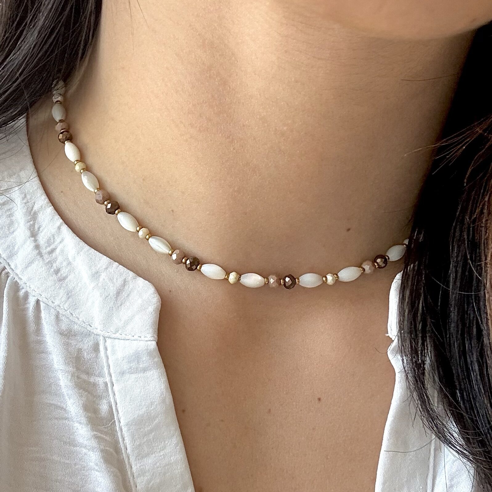 Composé de perles d’eau douce et de perles en verres, il incarne la douceur et la délicatesse.